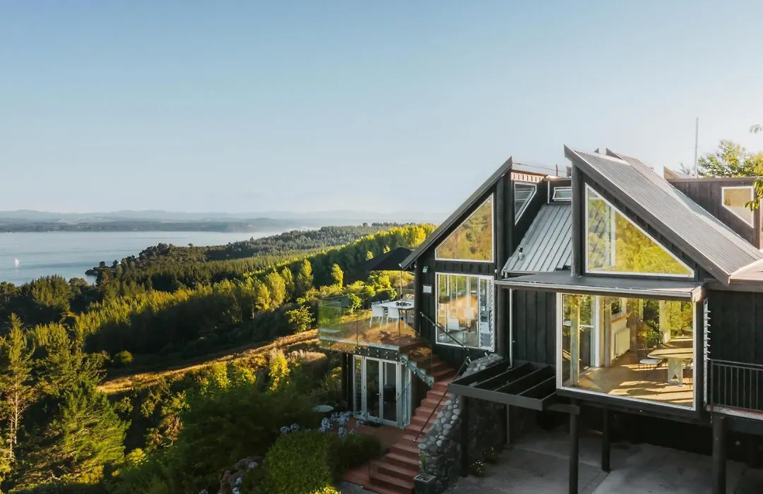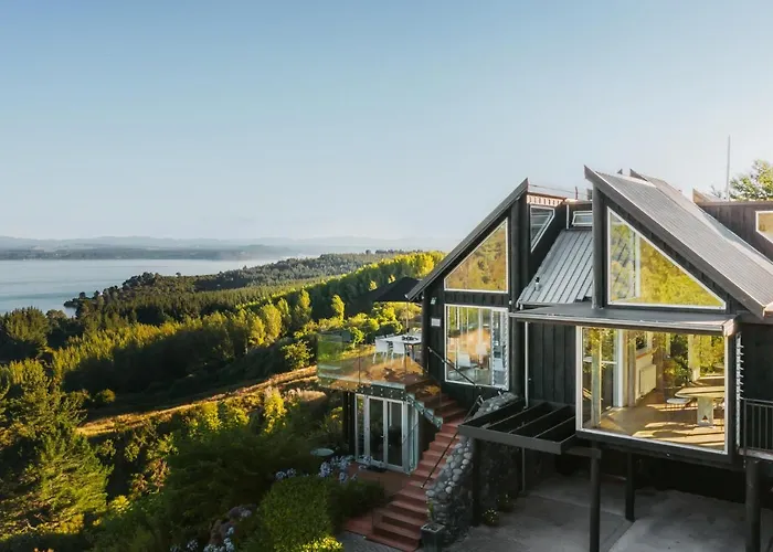 Acacia Cliffs Lodge, a 5-star boutique retreat, features breathtaking panoramic views of sparkling Lake Taupo and the surrounding mountain ranges. Designed by architect Kelvin Peck, it offers luxury accommodations, gourmet cuisine, and an intimate atmosphere for adults. This Taupo hotel accommodates up to eight guests in four super king rooms, each with private outdoor spaces.
