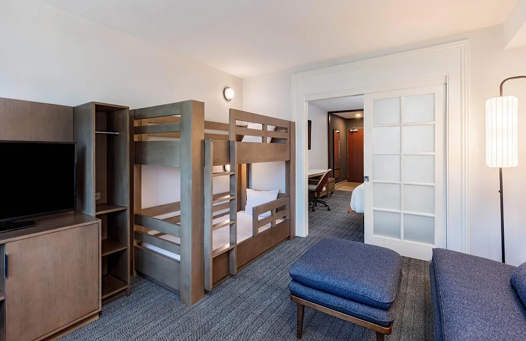 Spacious guest rooms at Courtyard Anaheim include free Wi-Fi, flat-screen TVs, and comfortable seating options. Family suites feature bunk beds and separate bedrooms, catering to families with children.