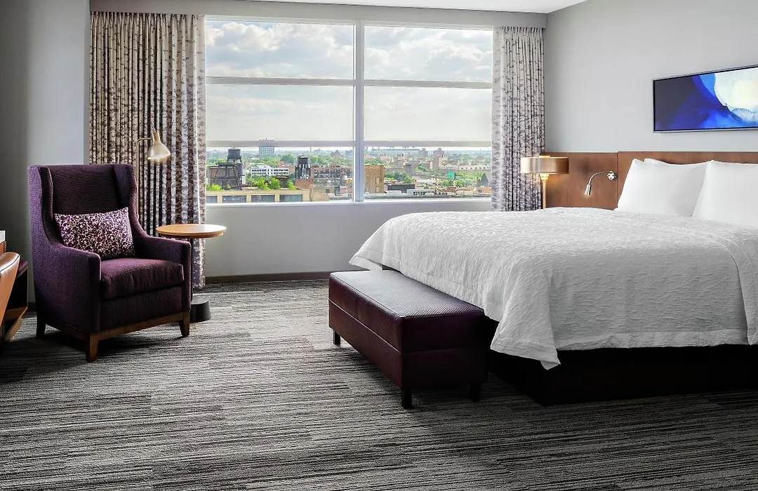 All guestrooms at Hilton Garden Inn Chicago McCormick Place include premium bedding, air conditioning, and modern amenities such as 55-inch HDTVs, complimentary WiFi, and a work area. Each room also features a microwave and mini-fridge for additional convenience.