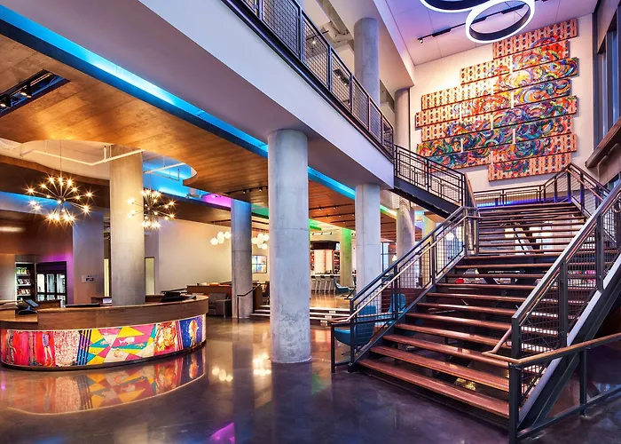The hotel features an indoor pool, a fitness center, and a social lobby with a pool table and seating areas. Guests can enjoy outdoor games and events on the Backyard patio, enhancing the leisure experience.