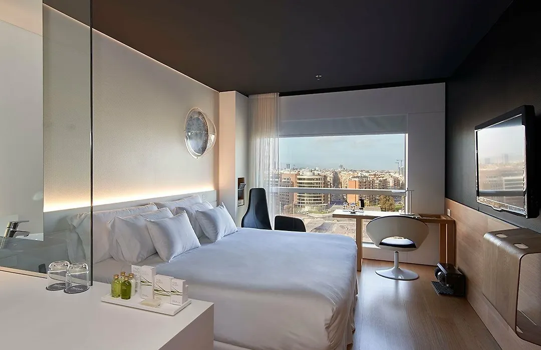 Barcelo Sants features 312 Orbital rooms, 52 Stratosphere rooms, and 14 Orbital suites, each designed with large windows offering views of the city and two distinctive portholes. These accommodations are equipped with HD TVs, docking stations for iPhones, and free Wi-Fi, providing both comfort and convenience.