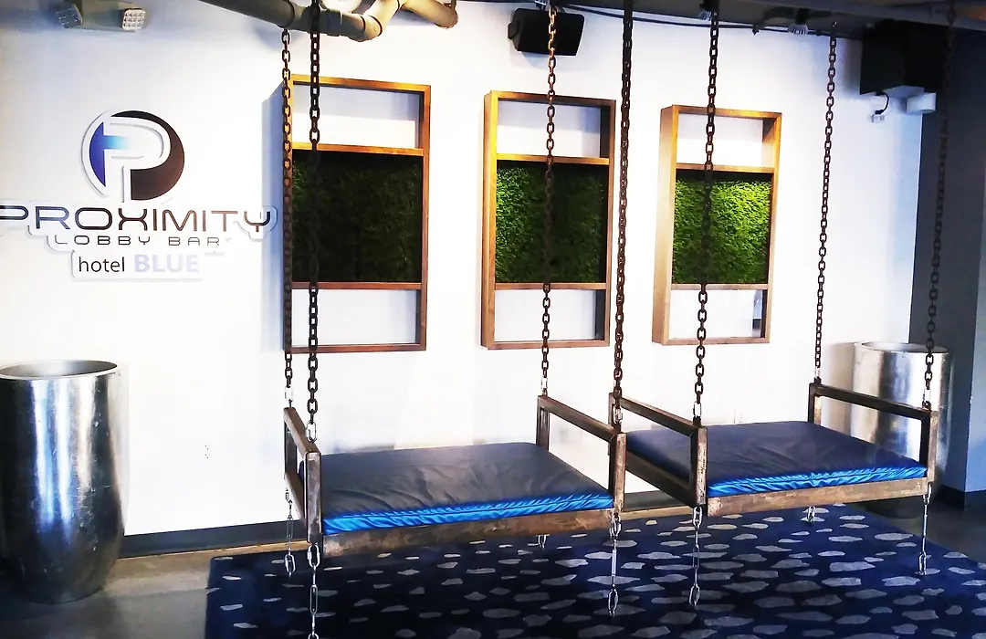 Dining options include Café Blue serving Starbucks coffee and casual meals, and the Proximity Lobby Bar for drinks. Guests also have access to the seasonal Loco Gecko Restaurant at the nearby Captain's Quarters hotel, which offers burgers, pizzas, and salads.