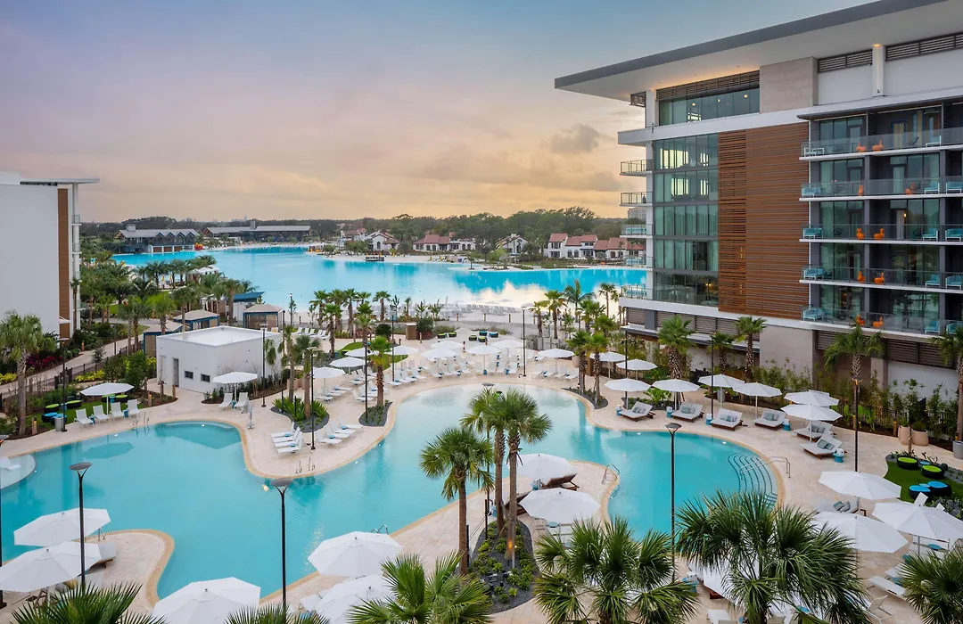 Conrad Orlando offers a 5-star experience with a 20-acre tropical beach and an 8-acre crystalline lagoon featuring an aquatic adventure area. This luxury resort includes amenities such as the Conrad Spa, a zero-entry pool, and five unique dining experiences.