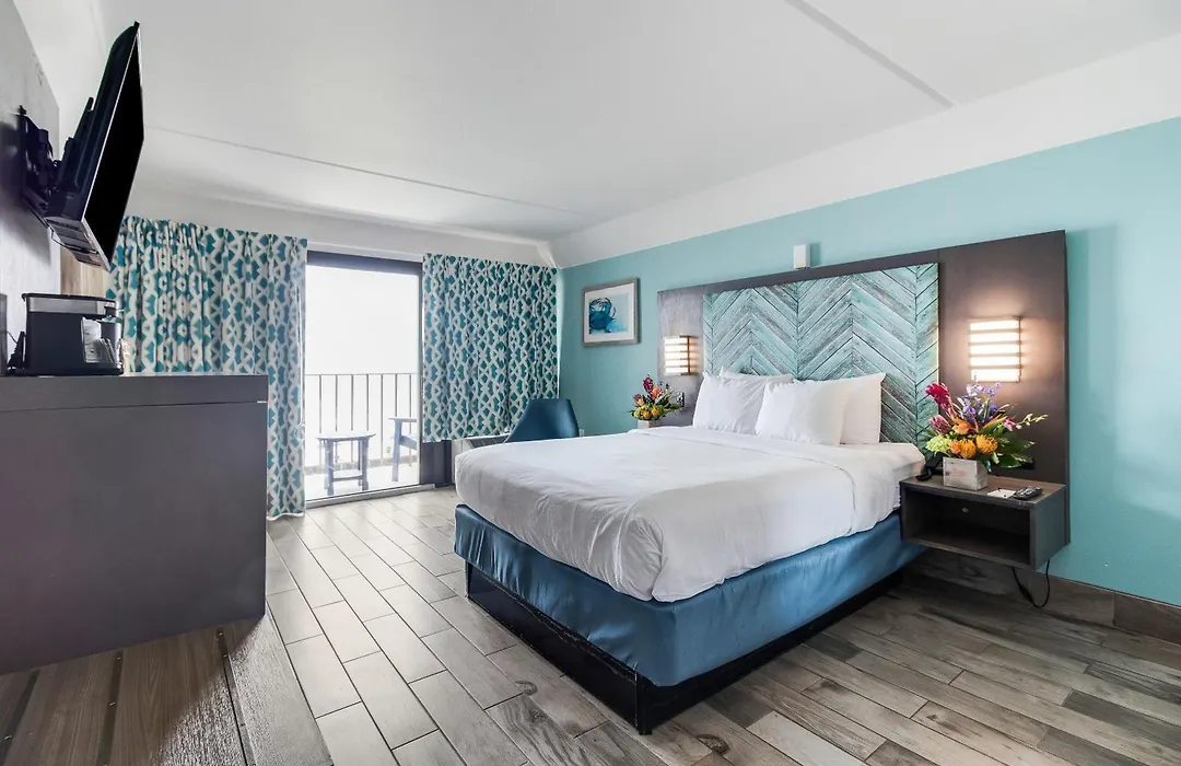 Rooms at Crystal Coast Oceanfront Hotel feature air conditioning, flat-screen TVs, and spacious layouts, with standard options including two double beds or a king-size bed. Each room includes a private bathroom with complimentary toiletries, ensuring convenience for all guests.