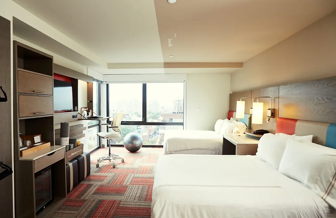 Each wellness room in Even Hotel Brooklyn By Ihg includes fitness equipment, free WiFi, and a spa-inspired shower. The rooms, designed for productivity, feature flexible workspaces, LED mood lighting, and natural eucalyptus linens for a comfortable stay.