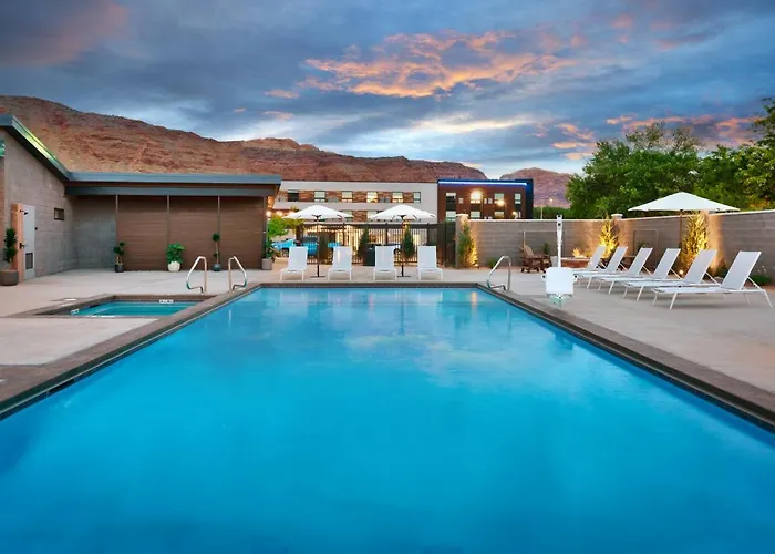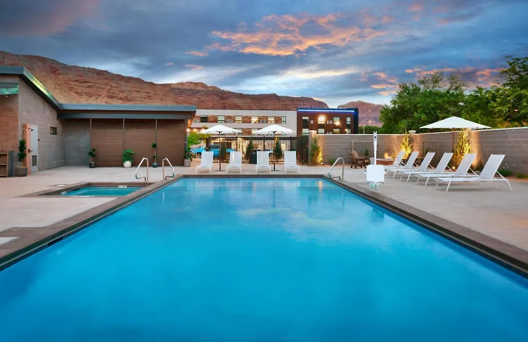 Leisure amenities feature a heated outdoor pool and hot tub with stunning red rock views. Guests can explore nearby landmarks like Arches National Park and Balanced Rock for outdoor activities.