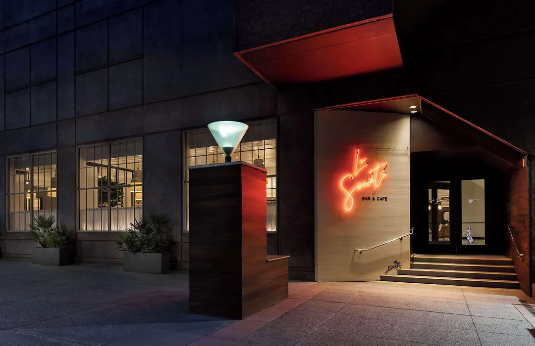 Dining options include the MaSo restaurant, serving fresh, locally sourced California cuisine. A buffet breakfast features items such as deli meats and cheeses, mini frittatas, and a variety of juices.