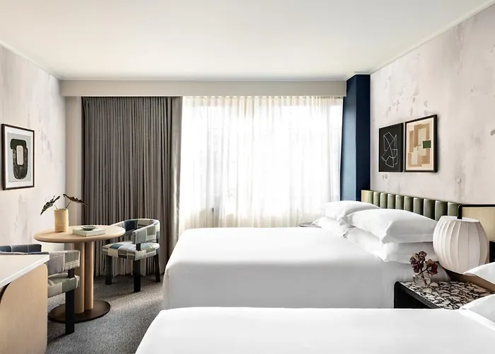 The hotel offers 369 oversized, newly renovated guest rooms equipped with 42-inch flat-screen TVs, plush bedding, microwaves, mini-fridges, and large work desks. Additional amenities include free Wi-Fi and streaming services, providing guests with a comfortable stay.