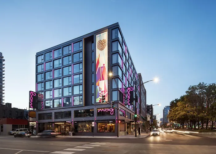 Moxy Chicago Downtown is situated within walking distance to major landmarks like the Art Institute of Chicago and Millennium Park. The nearest transportation options include the Grand 'L' station, just a five-minute walk away, and several bus routes nearby. Guests also have access to various dining and nightlife choices in the River North area.