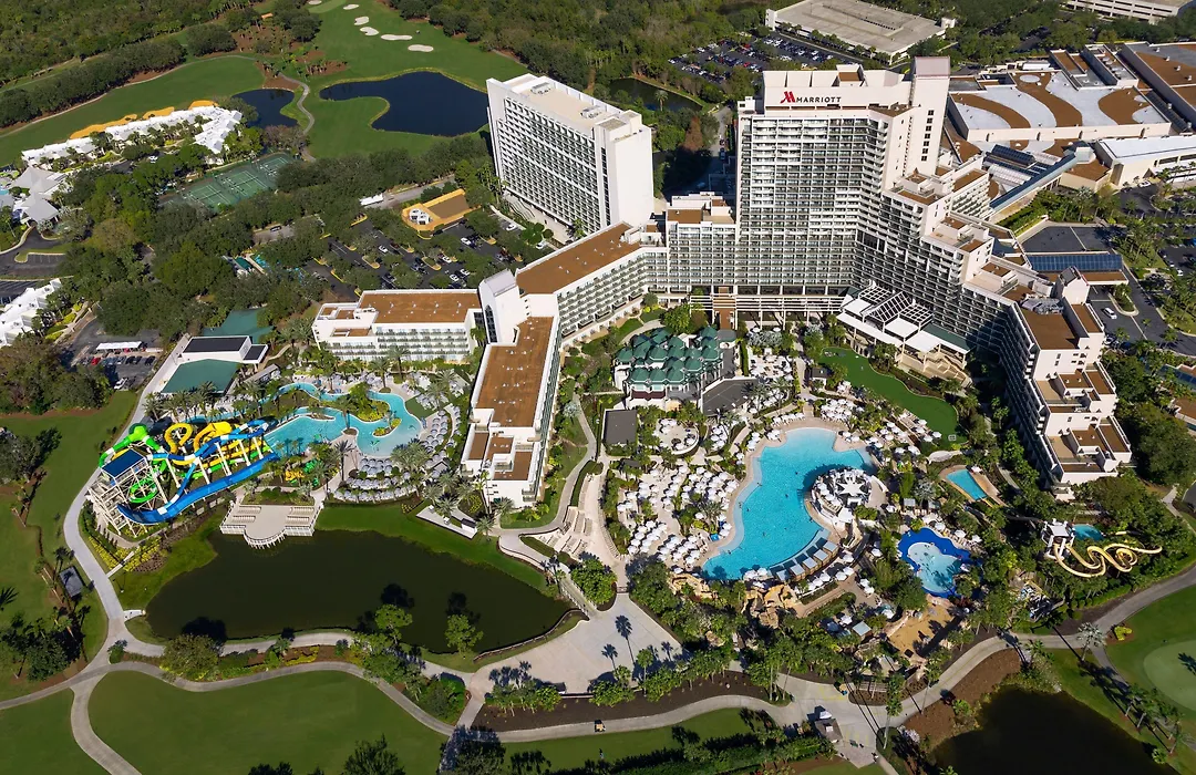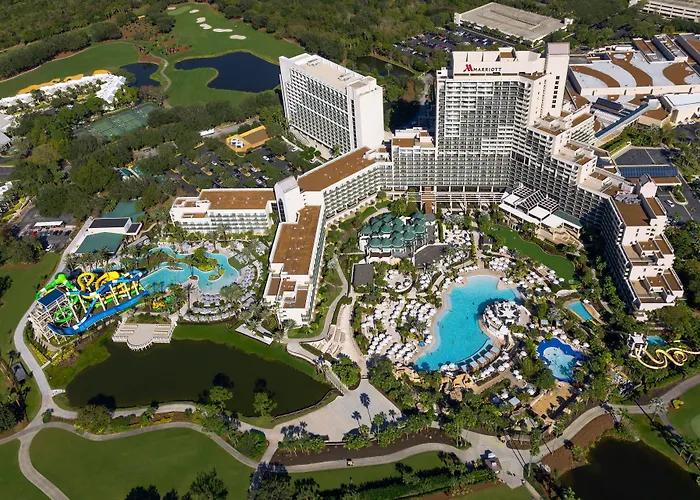 Orlando World Center Marriott offers a 4-star experience with access to a water wonderland featuring a 575-foot lazy river and seven thrilling waterslides. This Lake Buena Vista hotel includes amenities such as a spa, golf course, and ten dining options.