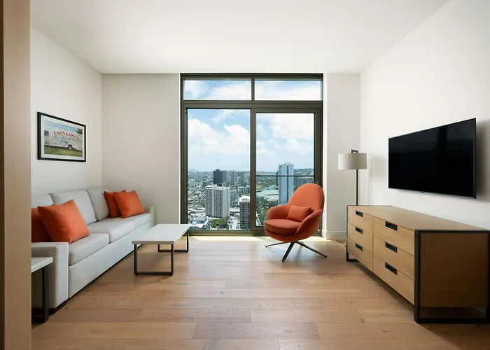 Renaissance Honolulu Hotel & Spa provides thoughtfully designed studio and one-bedroom residences with modern facilities, including a luxury gourmet kitchen featuring Sub-Zero and Wolf premium appliances. Spacious air-conditioned double rooms feature floor-to-ceiling windows, deep soaking tubs, and Aveda(TM) amenities.