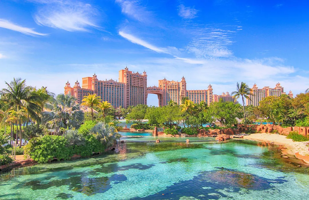 Leisure activities include access to the Paradise Island Aquaventure Water Park with waterslides and multiple pools. The resort also offers a golf course, wellness facilities, and the nearby Dolphin Cay, known for marine mammal interactions.