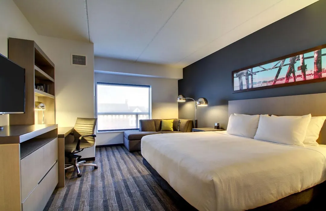Dining options include a complimentary full breakfast with hot selections served weekdays and gourmet grilled cheese sandwiches available at the on-site restaurant. Guests can unwind with drinks at the H Bar or purchase snacks from the 24/7 H Market.