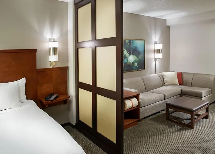 Guestrooms include a 42-inch high-definition flat panel TV, a signature Hyatt Grand Bed, and a plush Cozy Corner oversized sofa sleeper. Complimentary high-speed Wi-Fi access is available throughout the hotel.