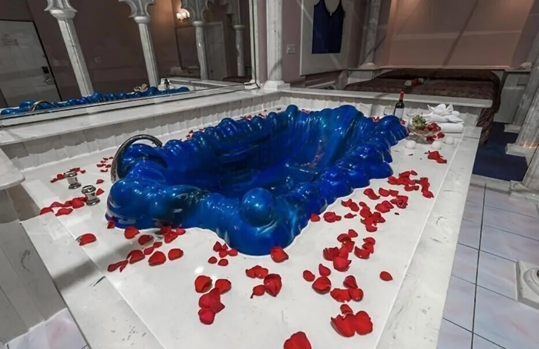Each suite at Loop Inn Motel features varied designs, from basic rooms with heart-shaped whirlpool tubs to the elegant Crystal Chalice Suite with its loft bedroom, oak staircases, and two flat-screen TVs. Regular Suites come equipped with lavish floral decorations, most having fireplaces, while the Paradise Suite boasts rainforest décor and a heated pool.