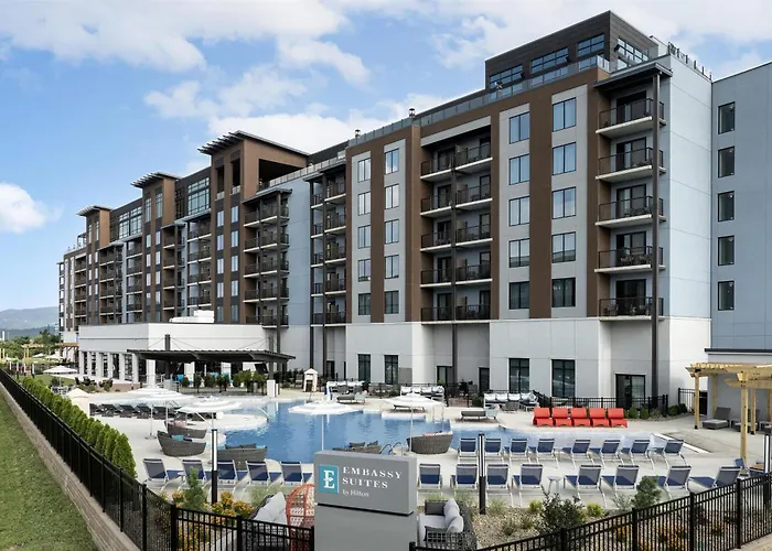 Embassy Suites offers a grand pool complex, suitable for families, featuring both indoor and outdoor swimming options, along with hot tubs. The location provides easy access to attractions such as Dollywood, just 2.5 miles away, and the Great Smoky Mountains National Park.