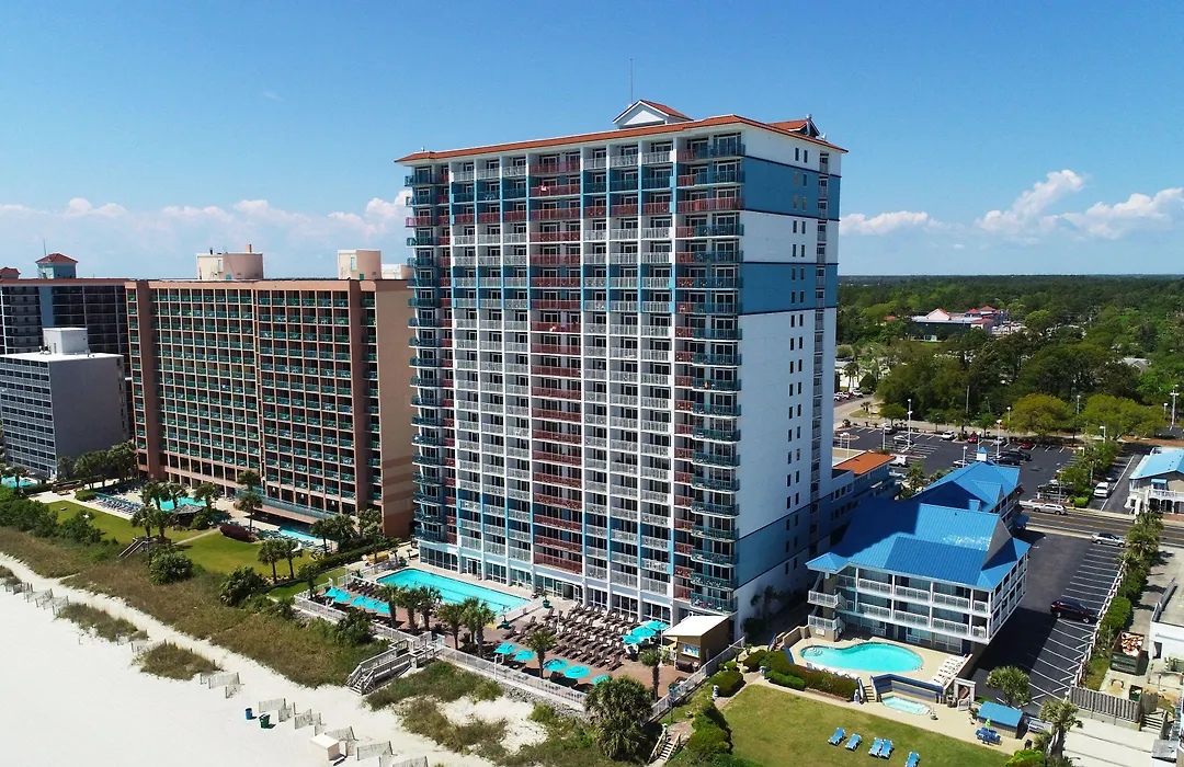 Paradise Resort is a 3-star oceanfront hotel in Myrtle Beach with an 8.4/10 rating on Booking.com, featuring family-friendly accommodations and an array of amenities. Guests can enjoy three swimming pools, including an outdoor oceanfront pool, jacuzzi, and lazy river, as well as a restaurant and convenience store on-site.