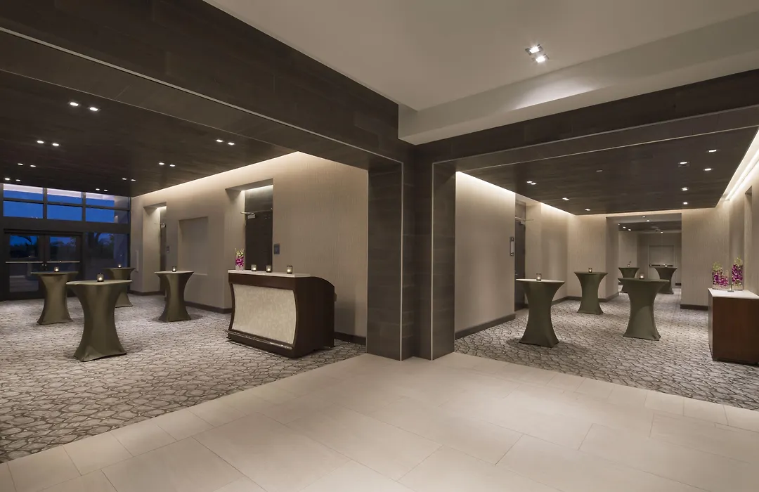 Zota Beach Resort offers extensive event facilities including the Zara Zota Ballroom, capable of accommodating up to 300 guests theater-style. The resort is equipped to handle mobility accessibility needs throughout various areas including the fitness center and meeting spaces.