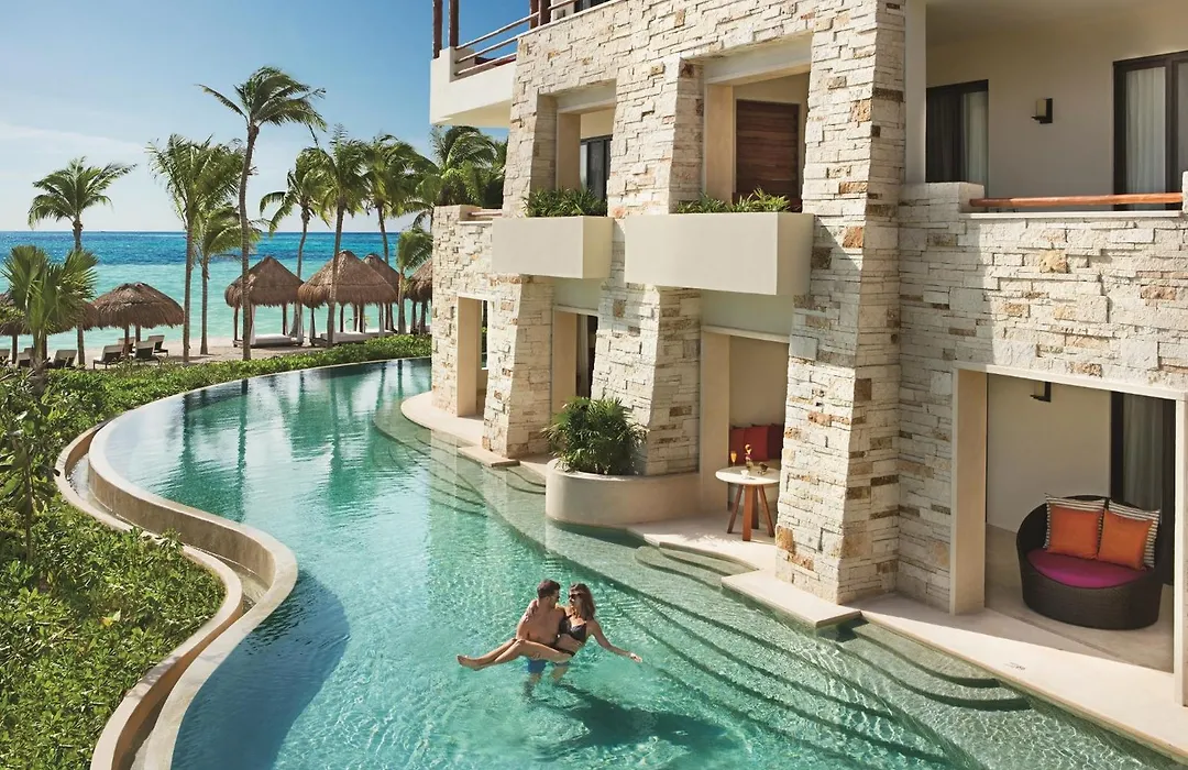 Secrets Akumal Riviera Maya - Adults Only is a 5-star, all-inclusive resort featuring luxurious amenities including an expansive pool area and a world-class spa. With a Booking.com rating of 9.5/10, the hotel boasts 434 suites designed for privacy and comfort.